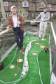 Play a round the Waspy way with the only mobile golf course in the world! 3 holes, bunkers, flags, the lot. Featured are Waspy (left) and David Greenfield, the landlord of The Queens Arms, Didcot, worldwide media coverage, Spring 2000. |