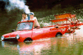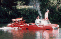 The only paddle driven mini in the world. Cement mixer engine, lots of cogs and chains, fibreglass, and a paddlewheel resulted in the Minissippi Thames Licensed. Great summer fun. Abandoned ship at the NEC, believed to be used for a viking funeral. National press and TV. Summer 96. |